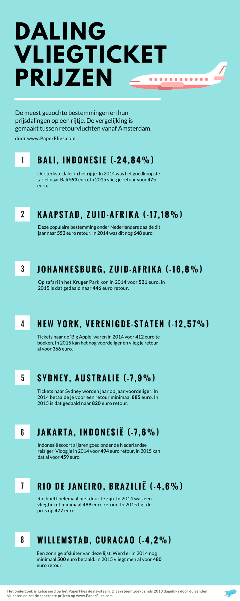 9.25 uur - 2015 is een goed jaar om een vliegticket te boeken. Ten opzichte van 2014 zijn de vliegticketprijzen flink gedaald. Van de 8 populairste bestemmingen zijn Bali en Kaapstad de sterkste dalers in prijs met respectievelijk 24,8 en 17 procent. Dit blijkt uit onderzoek van de vliegticket deal website PaperFlies.