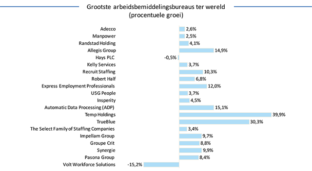 De top 3 van grootste recruitmentbureaus wereldwijd naar omzet (Adecco, Manpower, Randstad) zit stevig in het zadel. Gezamenlijk noteren ze een omzet die gelijk is aan het totaal van de overige 17 bureaus in de top 20. Allegis Group en Hays completeren de top 5. Grootste stijger in de top 20 is het Japanse Temp Holdings, dat klimt van positie 20 naar 13. Deze groei is mede te danken aan de overname van onder andere CareerRise en Panasonic Excell Staff.