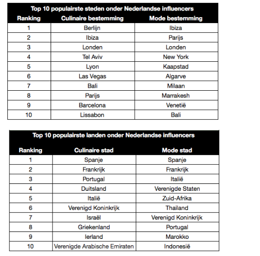 Waar Berlijn volgens Nederlandse influencers dé plek is om nieuwe foodtrends te ontdekken, vertoeven mode-influencers het liefst op Ibiza. Foodies en fashionista’s die iets verder van huis willen kunnen hun hart ophalen in New York voor inspiratie op het gebied van mode en in Tel Aviv voor culinaire verrassingen. Beide bestemmingen staan op de vierde plaats in de top tien.