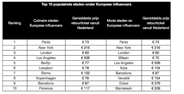 Reiszoekmachine KAYAK.nl deed onderzoek naar de populairste bestemmingen onder meer dan 200 Europese online influencers van het afgelopen jaar en stelde de top tien bestemmingen voor liefhebbers van mode en culinaire hoogstandjes samen. Ook zet KAYAK.nl de gemiddelde prijzen van vluchten naar deze topbestemmingen op een rij.