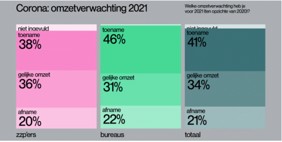 Uit de respons, die in de tweede helft van 2020 werd verzameld, blijkt dat de deelnemers aan het onderzoek somber zijn over het verwachte bedrijfsresultaat in 2020. De helft van de ondervraagden verwacht een afname van de omzet in vergelijking met 2019. Ondanks dat gevolgen van de pandemie op dit moment nog niet zijn te overzien, is een deel van de respondenten toch hoopvol gestemd over het huidige jaar 2021: zo'n tweevijfde van alle ontwerpers en bureaus verwacht een verbetering ten opzichte van vorig jaar. De ontwerpbureaus zijn daarbij positiever dan de zelfstandige ontwerpers.