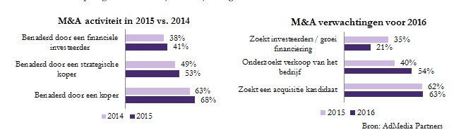 Een wereldwijde enquête, uitgevoerd door AdMedia onder marketing services, media en gerelateerde technologische ondernemingen, laat zien dat meer dan twee derde van de respondenten is benaderd door een mogelijke koper. Hiervan was meer dan de helft benaderd door een strategische koper. Nog eens twee derde van de respondenten verwacht in 2016 acquisitiekandidaten te zoeken.