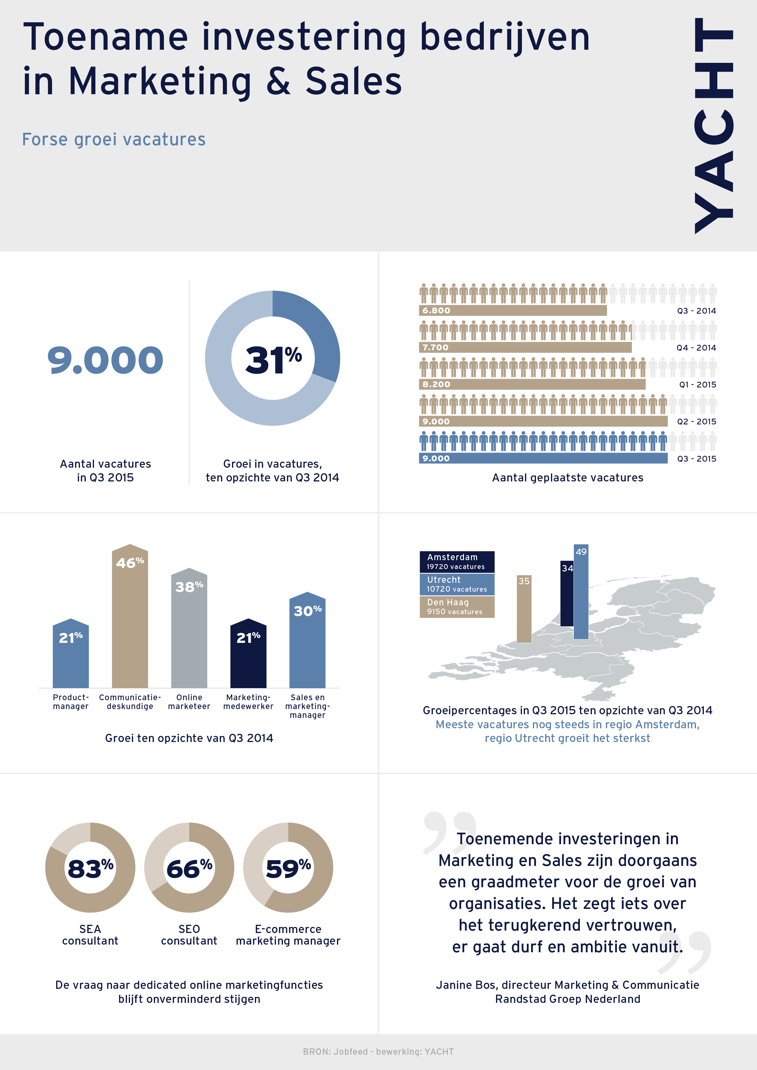 Opvallendste ‘stijgers’ zijn vacatures voor product marketeer, SEO (search engine optimization) marketeer en Internet marketing professional. De vraag naar deze functies is meer dan verdubbeld. Al eerder signaleerde Yacht duidelijke veranderingen in de functieomschrijving van marketeers: zij worden steeds vaker verantwoordelijk voor online en e-commerce resultaten.