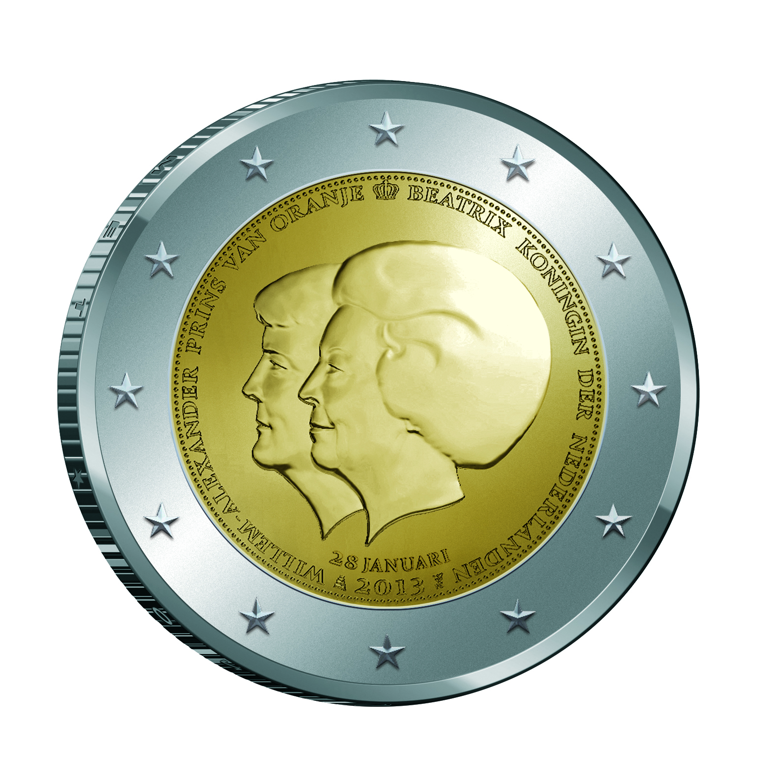 Op de munt worden zowel Hare Majesteit de Koningin als Zijne Koninklijke Hoogheid de Prins van Oranje geportretteerd. Daarbij wordt de regerende vorstin Koningin Beatrix, op de voorgrond afgebeeld. De Koninklijke Nederlandse Munt geeft daarmee een vervolg aan de muntuitgifte in 1980, toen bij de troonswisseling van Koningin Juliana en onze huidige Koningin Beatrix ook munten met dubbelportret werden uitgegeven. Vanaf volgende week wordt deze speciale uitgifte in circulatie van het geldverkeer gebracht in een oplage van maximaal twintig miljoen stuks.