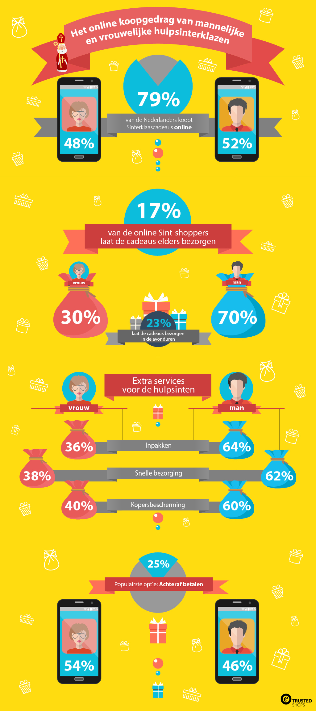 Het gemak zit hem echter niet alleen in het elders laten bezorgen. Mannen besteden het inpakken van de cadeaus graag uit. Van de mensen die gebruik maken van de inpakservice is 64% man. Daarnaast kiezen meer mannen voor snelle bezorging. Vrouwen houden er daarentegen meer van om pas achteraf te betalen.