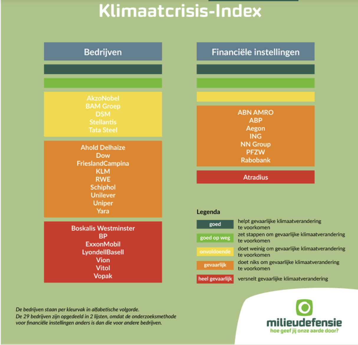 Dat de grote bedrijven tekortschieten in het nemen van klimaatmaatregelen bleek eerder dit jaar uit de Klimaatcrisis-Index, een onderzoek van NewClimate Institute naar de klimaatplannen van de 29 grote vervuilers. Milieudefensie had om de klimaatplannen gevraagd, in navolging van de rechtszaak tegen Shell, die onderstreept dat vervuilende bedrijven een grote verantwoordelijkheid dragen in het tegengaan van gevaarlijke klimaatverandering.