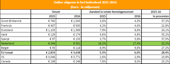 In totaal besteden we dit jaar 301 miljoen euro over de grens, 57 miljoen euro 23,2%) meer dan vorig Dit betekent dat in Nederland 17,4 procent van de kerstaankopen in het buitenland wordt gedaan. Buurland België staat met 9,8% op een tweede plaats. Het Europees gemiddelde is 6%. De reden dat over de grens shoppen erg populair is bij Nederlanders en Belgen, is waarschijnlijk de gunstige geografische ligging en de grootte van beide landen binnen Europa.