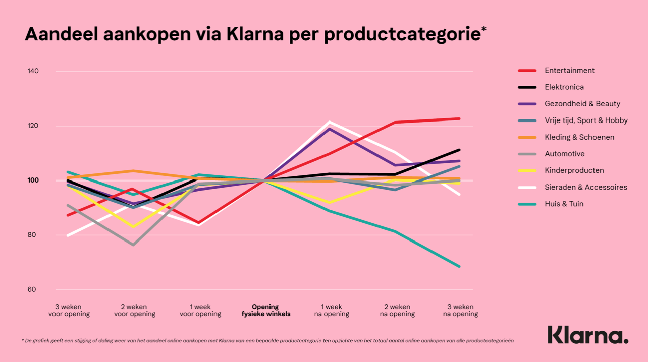 Sinds drie weken zijn de winkels in Nederland weer open. Veel mensen hebben inmiddels weer aankopen gedaan bij fysieke winkels. Maar welke invloed had dit op aankopen online? Klarna heeft als marktleider op het gebied van achteraf betalen en payment partner van meer dan 16.000 webshops in Nederland toegang tot een schat aan online shopping data en heeft een analyse gemaakt van alle transacties in de drie weken voor en na de opening van fysieke winkels in Nederland.