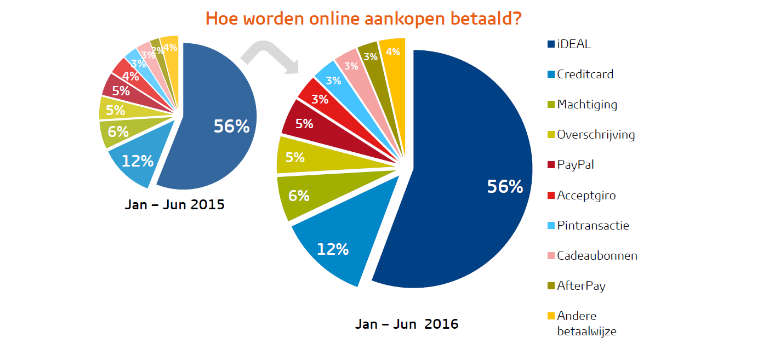 In het afgelopen half jaar zijn 45 miljoen online aankopen betaald met iDEAL. In totaal zijn er ruim 81 online aankopen gedaan door Nederlanders. De 45 miljoen iDEAL transacties betekenen een groei van 21% ten opzichte van het eerste half jaar van 2015 (ca. 38 miljoen), dit is in lijn met de ontwikkeling van de totale online markt (+21%). Voor de meeste overige betaalmiddelen geldt dat hun aandeel binnen de totale online markt stabiel blijft. De acceptgiro blijft wel terrein prijsgeven, met een aandeel van 3%.
