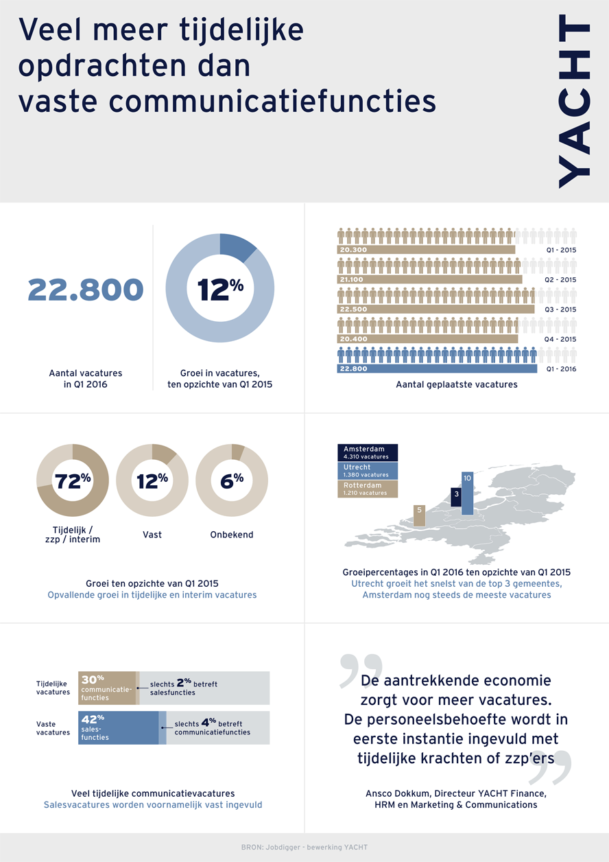 De groei in vacatures in marketing, communicatie en sales zet door. In het eerste kwartaal was de groei 12% ten opzichte van het eerste kwartaal in 2015. Met name tijdelijke en interimfuncties nemen toe, blijkt uit arbeidsmarktonderzoek van Yacht.