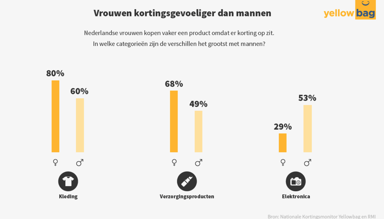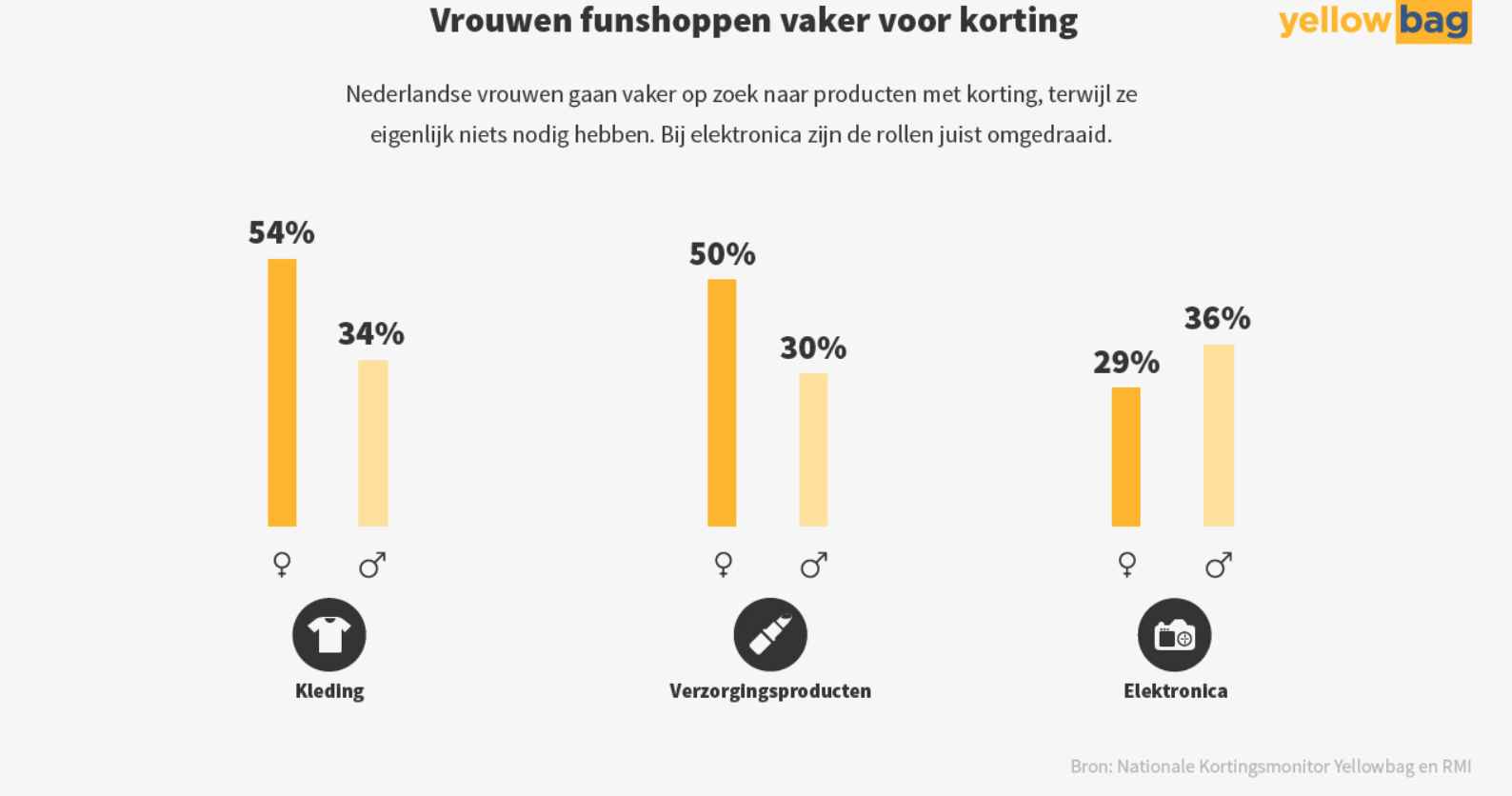 Nederlandse vrouwen bezwijken veel sneller voor kortingen dan mannen. Vooral korting op kleding leidt bij vrouwen veel sneller tot een impulsaankoop dan bij mannen het geval is. Dit betekent overigens niet dat mannen alleen maar rationeel shoppen: impulsaankopen op elektronica worden juist weer vaker door mannen gedaan. Dit blijkt uit onderzoek van kortingsapp Yellowbag onder ruim 800 Nederlanders.