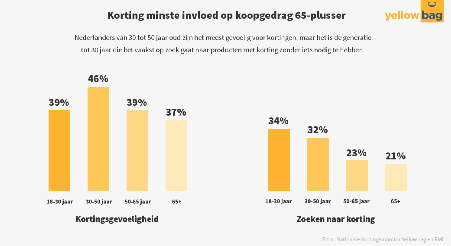 Ook tussen leeftijdsgroepen zijn er opvallende verschillen. Jasper van Elferen, oprichter van Yellowbag, licht toe: 'Generatie Y en de babyboomgeneratie zwichten gemiddeld gezien het minst vaak voor korting. Maar een derde van de personen tot 30 jaar gaat weer wel op zoek naar producten met korting terwijl ze niks nodig hebben. Van alle leeftijdsgroepen is dit het hoogste aandeel. Bij 65-plussers is dit juist weer het laagst, namelijk een vijfde.'