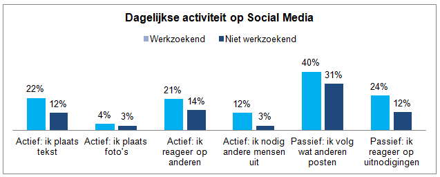 Meer dan één op de vijf plaatst dagelijks berichten en reageert op die van anderen. Ook lezen ze vaker de berichten van hun online netwerk. Het enige onderdeel waarop actief werkzoekenden zich niet onderscheiden van niet-werkzoekenden is in het dagelijks plaatsen van foto’s.