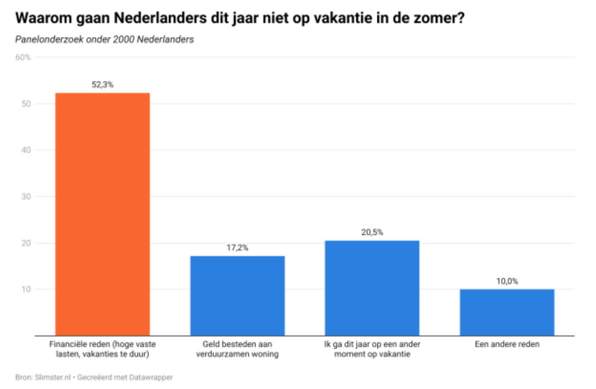 Het onderzoek van Slimster, dat 2000 Nederlanders ondervroeg, laat zien dat met name inwoners van de provincie Drenthe, Groningen en Zuid-Holland dit jaar hun zomervakantie moeten laten schieten. Op leeftijdsniveau valt op dat het vooral de twintigers en dertigers zijn die dit jaar, veelal noodgedwongen, thuisblijven. Al met al noemt liefst 52 procent dat er financiële redenen ten grondslag liggen aan deze beslissing. Ook geeft 20 procent aan dit jaar weliswaar niet in de dure zomermaanden op vakantie te gaan, maar bewust buiten het hoogseizoen.