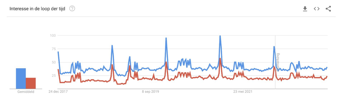 Zie hieronder de interesse in zoekopdrachten naar twee van de grote supermarkten in ons land in de afgelopen vijf jaar. Albert Heijn is de blauwe lijn; Jumbo is de rode. Je raadt het al: de pieken vallen ieder jaar in de tweede helft van december.