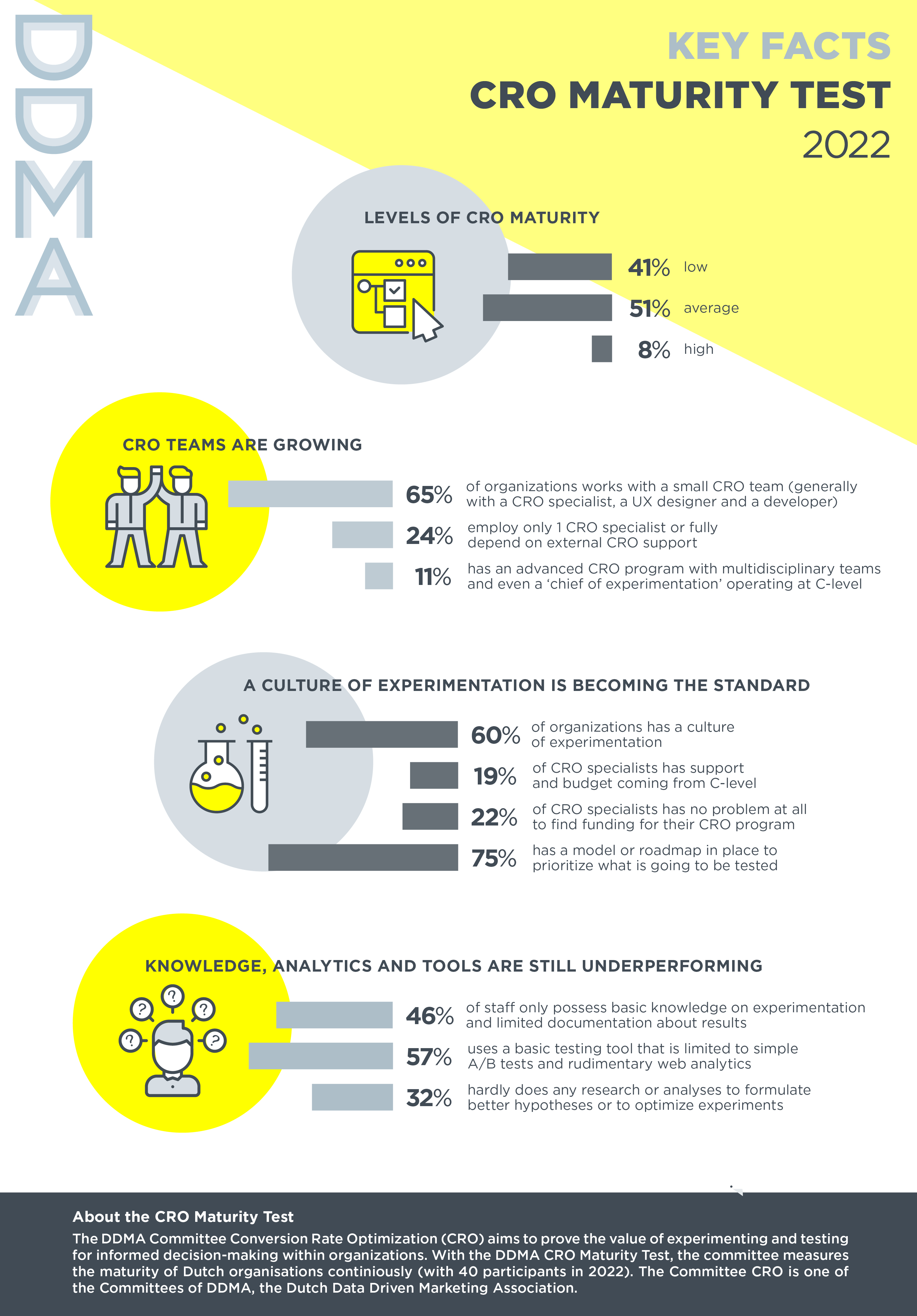 Aan de hand van 14 vragen kunnen organisaties met de DDMA CRO Maturity Test zien hoe volwassen zij zijn op het gebied van CRO en testen. De meeste bedrijven (51%) scoren qua volwassenheid een voldoende met volop groeikansen, terwijl bij 41% het CRO-programma nog in de kinderschoenen staat. Slechts 8% van de deelnemers is echt vergevorderd op CRO-gebied.