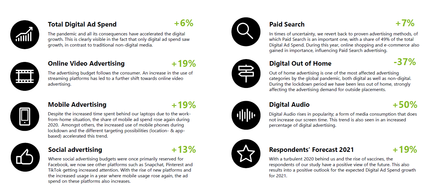 Naast een aanhoudende groei van online video (+19%) laten de cijfers zien dat alle digitale categorieën zijn gegroeid, met uitzondering van Digital Out of Home-advertising, die met 37% daalde. De daling is toe te schrijven aan de maatregelen rond COVID-19. De respondenten gaven aan dat door alle onrust de behoefte aan ROI en beproefde methodes toenam, met als gevolg dat er minder brandingcampagnes zijn ingezet. Voor 2021 verwachten de respondenten wederom een sterke groei van digital advertising in zijn geheel, waarin een belangrijke functie is weggelegd voor marketplaces.