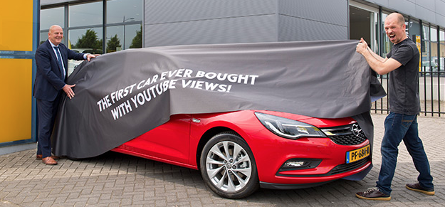 Een primeur bij de Opel-dealer in Veghel: 's werelds eerste auto die met YouTube-views is gekocht, is daar vandaag afgeleverd. Yuri Schuurkes wist met zijn spraakmakende video al meer dan een miljoen views te verzamelen en 'kocht' daarmee een gloednieuwe Opel Astra vijfdeurs Online Edition ter waarde van 23.070 euro. campagne