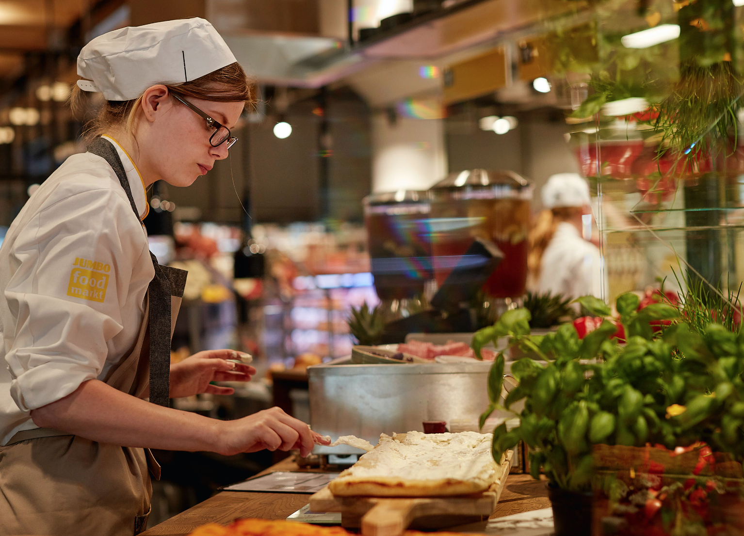 Foodmarkt City by Jumbo bereidt ter plekke op ambachtelijke wijze verse maaltijden die overeenstemmen met de eetmomenten van de dag. De gerechten, maar ook de pizza’s, sushi, broodjes, soepen en sappen, zijn met verse producten in eigen keuken en bakkerij bereid volgens recepturen van La Place en Jumbo Foodmarkt. Colette Cloosterman-van Eerd benadrukt dat het familiebedrijf dáár wil zijn waar de klant is. “We willen op elk moment voor elke eetbehoefte een passende oplossing bieden. In onze reguliere winkels en via onze online winkel kan de klant de wekelijkse boodschappen doen en laten thuisbezorgen of ophalen. Voor meer inspiratie, een echte food beleving en gezonde en verse maaltijden om ter plekke op te eten, mee te nemen of thuis te maken, is Foodmarkt de uitgelezen plek.