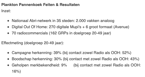 Al na een week wist het niet bestaande merk een grote bekendheid te genereren. Uit onderzoek van Mindshare blijkt dat maar liefst 39 procent van Nederland herinnert de campagne te hebben gezien en/of gehoord. Onder degenen die in contact zijn gekomen met zowel radio als buitenreclame is dat zelfs 52 procent. In één week tijd heeft het tot dan toe onbekende merk een merkbekendheid van 9 procent gerealiseerd. Onder degenen die in contact zijn gekomen met zowel radio als buitenreclame is dat zelfs 16 procent. Daarnaast telde de website planktonpannenkoek.nl de eerste week al ruim 30.000 unieke bezoekers. Doordat het om een fictief product gaat weten de onderzoekers dat de gevonden effecten volledig aan de media-inzet toe te schrijven zijn.