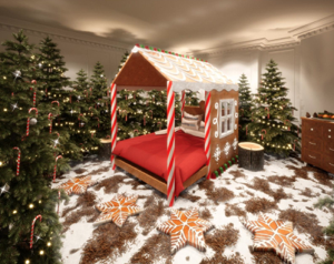 bij aankomst gelijk al een hap nemen van de kerstkrans aan de voordeur. Binnen is ook genoeg te snoepen in de Ginger-breadroom en de Choco-Kitchen.Elke kamer is in kerstsferen versierd. Voor dat wat niet eetbaar is, heeft Booking.com biologisch afbreekbare kunstsneeuw en ecovriendelijke glitter gebruikt en de overgebleven artikelen worden na afloop aan een goed doel gedoneerd.