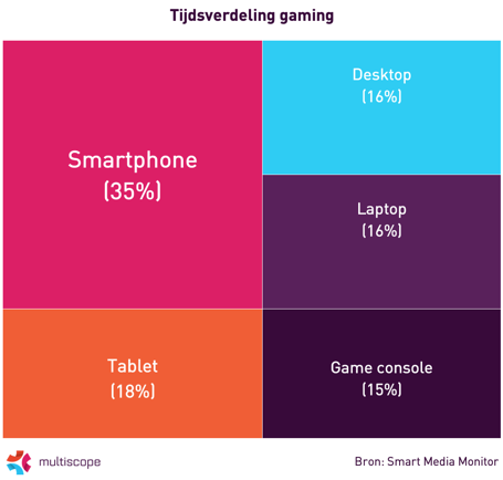 Nederlanders gamen samen bijna een half miljard minuten per dag. De smartphone is daarbij favoriet, het gamen op dat mobiele device verslaat met 35 procent het aandeel gebruiksminuten op de console (15%). Dat blijkt uit de tweede editie van de Smart Media Monitor, een onderzoek van Multiscope onder 3.600 Nederlanders.