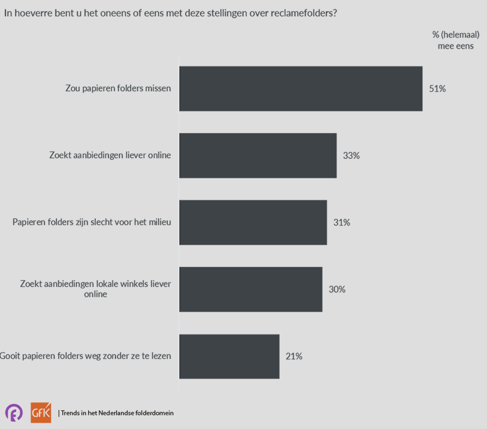 Ruim 75 procent van de ondervraagden zegt echt te genieten van een goede deal. Opvallend is dat 66 procent aangeeft dat zij een grote aankoop ruim van tevoren plannen en bewust wachten met aanschaffen totdat er voordeel te krijgen is. Hierbij koopt 62 procent het product liever bij de ‘bekende’ winkelketen en 38 procent liever bij lokale ondernemers. Nog maar 51 procent van de circa duizend respondenten geeft aan de papieren folders te missen als deze straks helemaal verdwijnen. Met name het milieuaspect is voor 31 procent van de ondervraagden een belangrijke reden om geen papieren folders meer te willen ontvangen en online naar korting te zoeken.