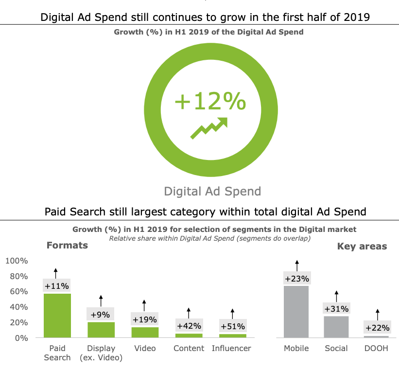 Verder blijkt uit de cijfers dat met name content in het eerste halfjaar van 2019 sterk is gegroeid. Volgens IAB Nederland komt dit vooral doordat publishers het gemakkelijker maken om content in te kopen. Zo is er een verbreding zichtbaar in het productaanbod in contentmarketing. Wel plaatst Deloitte de kanttekening dat tegenwoordig de budgetten van content advertising lastiger zijn vast te stellen doordat er vaker totaalpakketten worden verkocht. Datzelfde geldt voor display advertising (voorheen banner advertising), waarover de respondenten aangaven dat het steeds lastiger is om budgetten uit te splitsen in traditionele banners, rich media en allerlei andere formaten.
