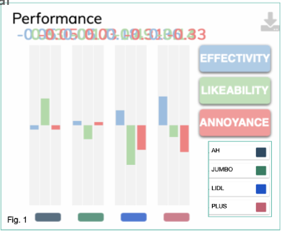 van Adformatie is uitgevoerd onder het ‘grote publiek’. Als je aan mensen vraagt wat de beste commercial is dan zegt men op 1, 2 en 3 respectievelijk Jumbo, Lidl en Plus. Als je de dezelfde doelgroep in hun brein kijkt, is de volgorde Plus, Lidl, Jumbo. Althans wanneer het om effectiviteit gaat. Kijken we naar waardering of het betere Engelse begrip ‘likability’ dan steekt Albert Heijn er met kop en schouders bovenuit. In de benchmark-analyse (fig.1) zien we de correlatie die de 4 TVC’s hebben met de benchmarks. Jumbo scoort als een gemiddelde reclame terwijl Plus -en Lidl als goede tweede- sterk correleert met Effies. AH is de enige die meer dan gemiddeld en zeer hoog scoort op likability.