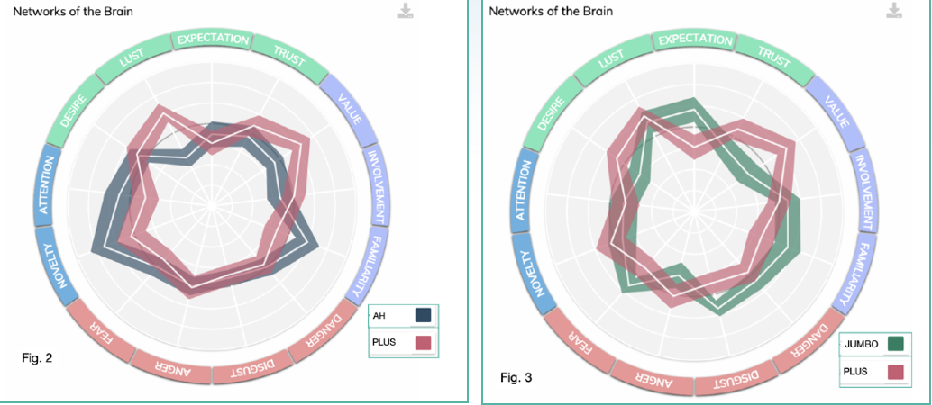 De sleutel tot het succes in de commercial van Plus lijkt de wederkerigheid te zijn. Kuddedieren als wij mensen zijn, is wederkerigheid een bijzonder sterk affect. In fig. 2 de vergelijking van Plus en AH in de activatie van de afzonderlijke emoties. De witruimte tussen de beide metingen laat de significante verschillen zien. De plus commercial hier in het rood scoort overtuigend beter in waarde (Value) en verlangen (Lust). Vergelijken we Plus met Jumbo dan zien we dat deze laatste significant sterker scoort op afkeer (Disgust) en ook wat meer gevaar activeert (Danger). Ervaring met de interpretatie van recente TV-commercials leert dat het zien van een grote groep mensen bij elkaar in deze tijd van de corona-angst als onprettig wordt ervaren.