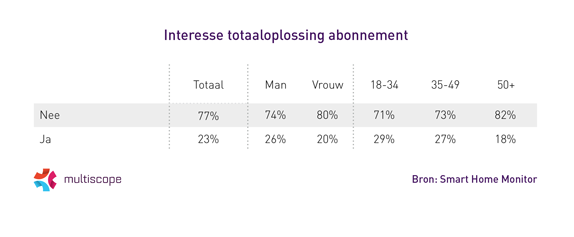 Eén op de vijf Nederlanders geeft aan interesse te hebben in een smart home totaaloplossing waarbij slimme verwarming, verlichting, beveiliging, huishoudelijke apparaten en speakers in één keer geïnstalleerd worden (20 procent). Dit komt neer op 1,5 miljoen Nederlandse huishoudens. Wanneer deze totaaloplossing in abonnementsvorm wordt aangeboden dan is de interesse nog groter (23 procent). Meer dan 1,8 miljoen huishoudens zijn bereid om een maandelijks bedrag te betalen voor een slim huis. De groep geïnteresseerden in een smart home totaaloplossing zijn vaker mannen (26 procent) dan vrouwen (13 procent). Daarnaast blijkt dat hoe jonger men is hoe vaker men geïnteresseerd is.