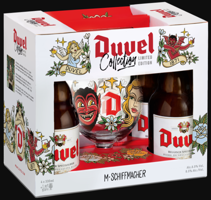 op het Duvel glas tot stand is gekomen. Schiffmacher over haar ontwerp: ‘Ik ben direct in de geschiedenis van Duvel gedoken en het verhaal over het duveltje en het engeltje op het etiket grepen mij direct. Mijn ontwerp laat niet het contrast, maar juist het samenspel tussen goed en kwaad zien, de verbondenheid tussen de duivel en engel. Een metafoor voor het leven, en dus ook voor een avond in de kroeg.’De PR rondom de campagne wordt verzorgd door Nikki van Outheusden en Danielle Faas. Het collector’s item art glass is tijdelijk verkrijgbaar in en gift pack met vier flesjes Duvel bij vrijwel alle grote supermarkten en slijterijen.