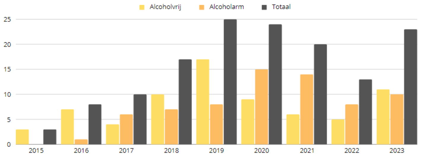 De afgelopen jaren is het aanbod alcoholvrij bier in Nederland flink gegroeid. Uit onderstaande grafiek met data van Biernet.nl blijk dat er de afgelopen jaren een heleboel alcoholvrije en -arme bieren bij zijn gekomen in Nederland.