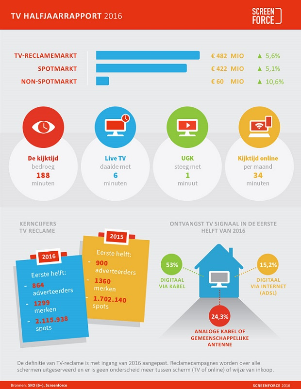 De TV-reclamemarkt is uitgekomen op € 482 mio in de eerste helft van 2016. Een groei van 5,6% ten opzichte van 2015. Een deel van deze groei wordt veroorzaakt door het samenvoegen van de omzetten van TV en online video. De markt heeft in de eerste helft van het jaar echter ook een autonome groei laten zien van 1,7%.
