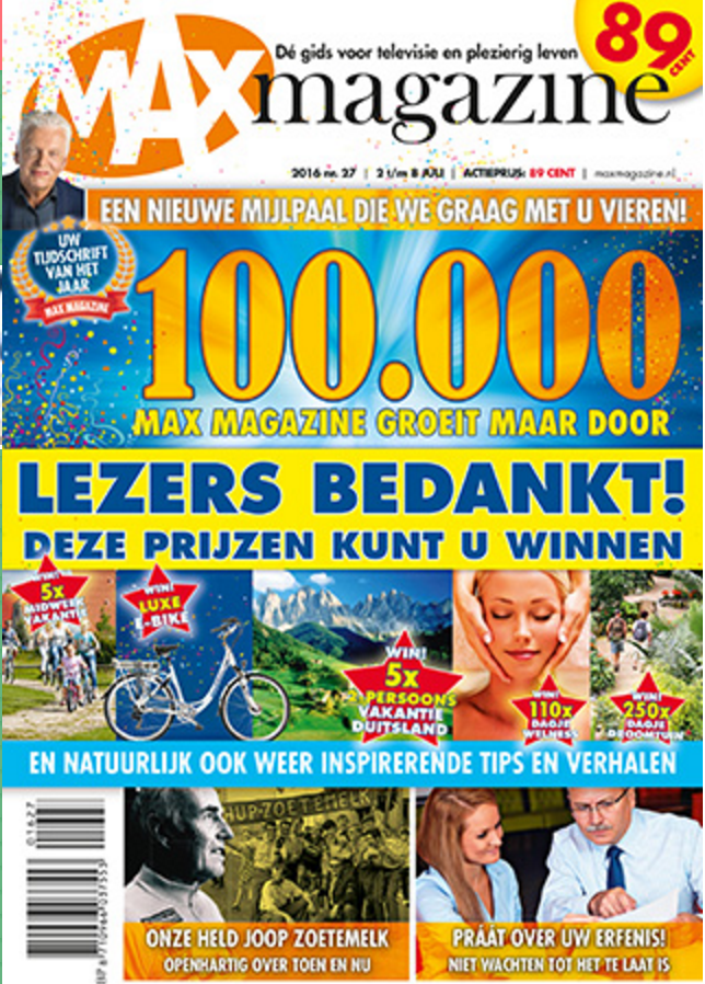 De betaalde oplage van MAX Magazine, de tv-gids van Omroep MAX, heeft de mijlpaal van 100.000 exemplaren per week bereikt. Dit blijkt uit de actuele oplagecijfers van distributeur Betapress en abonnementenbeheerder Mediacompetence. MAX Magazine is sinds de oprichting in 2013 het enige in oplage stijgende omroepblad van Nederland.
