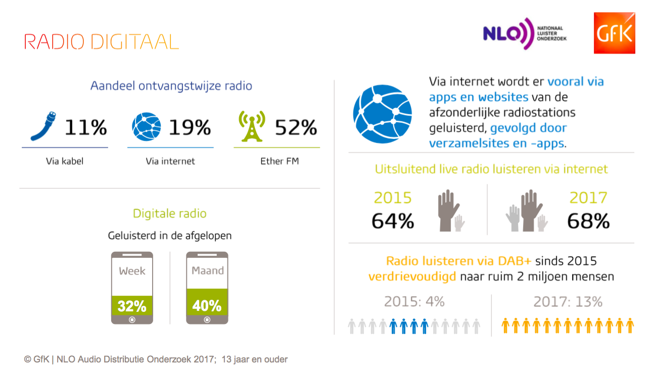 Het gebruik van DAB+ groeit weliswaar flink, maar met een marktaandeel van 13% komt het nog niet in de buurt van FM. Dat geldt ook voor het luisteren via internet (19%), kabel (11%) en digitale radio via tv (9%)