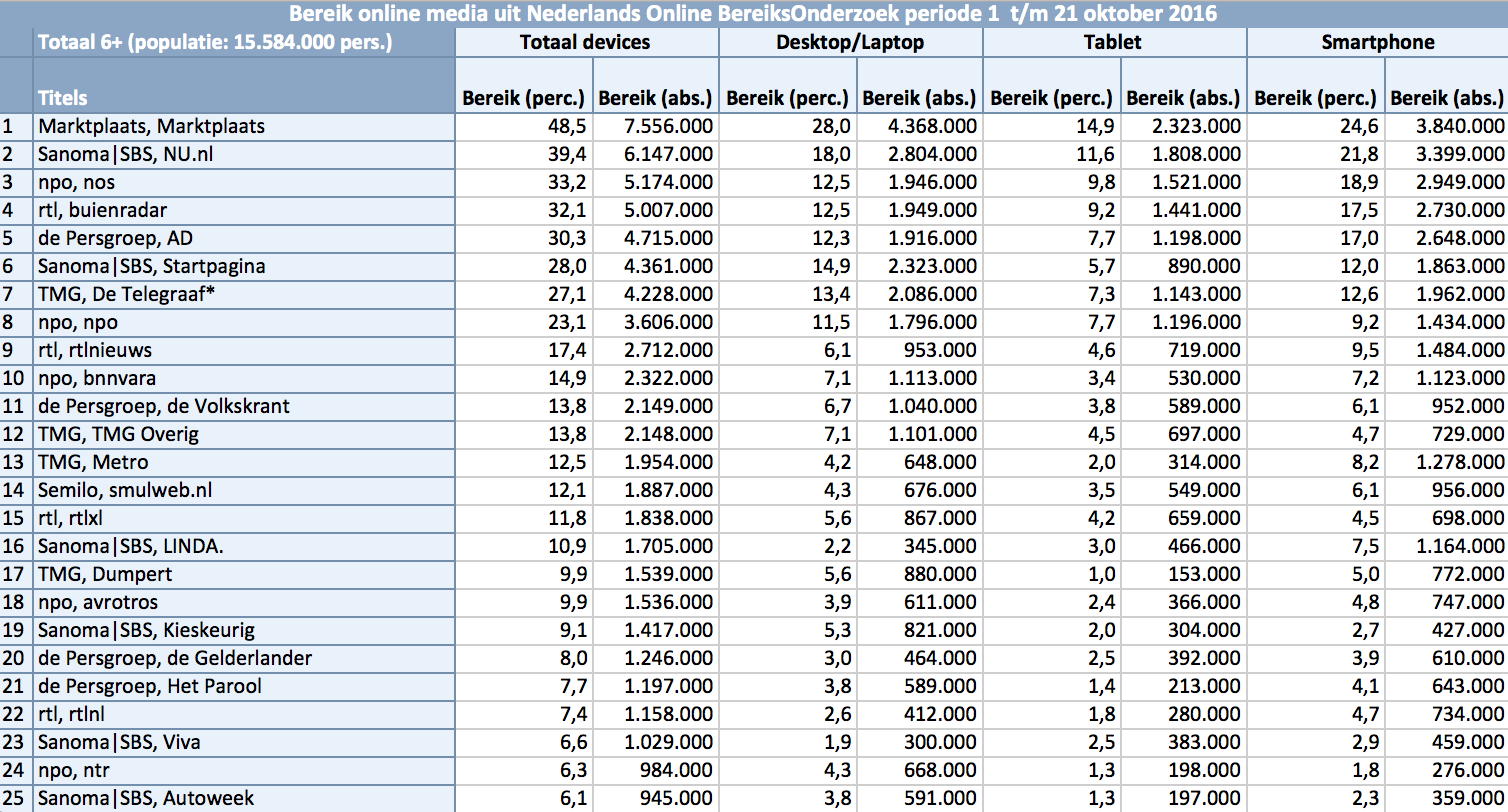 De eerste toplijsten laten de grootste online spelers in Nederland zien. Onder de Nederlandse merken zijn Marktplaats, Nu.nl en Buienrader het grootst. Ook nieuwsmerken als RTL Nieuws, NOS, AD en Telegraaf zijn in de toplijst te vinden. In rankings van specifieke doelgroepen gaan andere mediamerken aan kop.