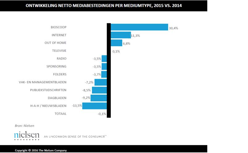 Internet, out of home en bioscoop zagen de mediabestedingen het sterkst toenemen.Televisie sloot het jaar met een nipte plus, de overige mediumtypen hadden te maken met dalende inkomsten uit de verkoop van advertentieruimte. Dit blijkt uit het Jaarrapport Netto Mediabestedingen 2015 dat Nielsen binnenkort publiceert.