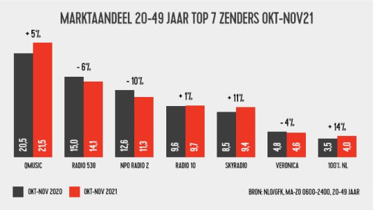 Met een weekbereik van afgerond 3 miljoen luisteraars is Q ook in absolute aantallen de best beluisterde zender.