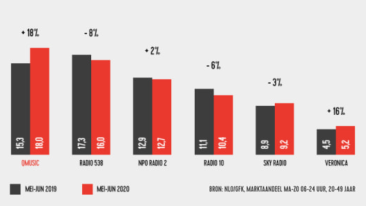 Voor de derde maand op rij is Qmusic marktleider in de doelgroep 20-49 jaar. De radiozender scoort in de periode mei-juni een marktaandeel van 18,0 procent. Een stijging van 18 procent ten opzichte van vorig jaar. Dat blijkt uit de meest recente luistercijfers gepubliceerd door NLO/GfK.