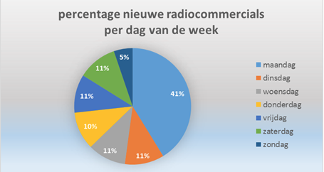 Uit een analyse van Adfact blijkt dat er jaarlijks 11.000 nieuwe radiocommercials worden geproduceerd en aangeleverd bij de radiozenders. In mei, juni en december zijn er pieken met meer dan 1.050 nieuwe radiocommercials per maand. Gemiddeld zijn er wekelijks ruim 300 lopende radiocampagnes en veruit de meeste nieuwe radiocampagnes beginnen op maandag.