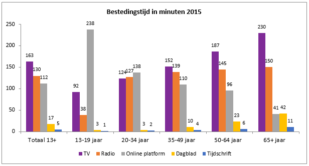 Van alle media besteden Nederlanders de meeste tijd aan het TV-kijken, bijna 2 uur en drie kwartier per dag. Dit geldt voor live, uitgesteld en on-demand TV-kijken, ongeacht via welk apparaat. Jongeren tussen 13 en 19 jaar besteden de meeste tijd op het online platform (sociale media, online muziek, e-mail, etcetera), 3 uur en 58 minuten.