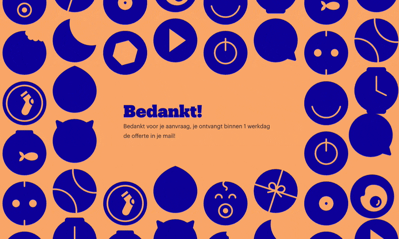Een goed voorbeeld hiervan is het 'bedankt'-scherm van cadeaukaart.bol.com. Bol.com heeft een hele eigen stijl waarin illustraties een rol spelen. Dat kun je natuurlijk op allerlei toffe manieren doorvertalen. We wilden motion inzetten om het speelse karakter van het merk verder ondersteunen. Uiteindelijk zijn we uitgekomen op een interactief achtergrondpatroon waar je met je muis de illustraties weg kunt duwen als een soort magneet. Een leuke beloning voor wanneer je een bestelling hebt geplaatst.”