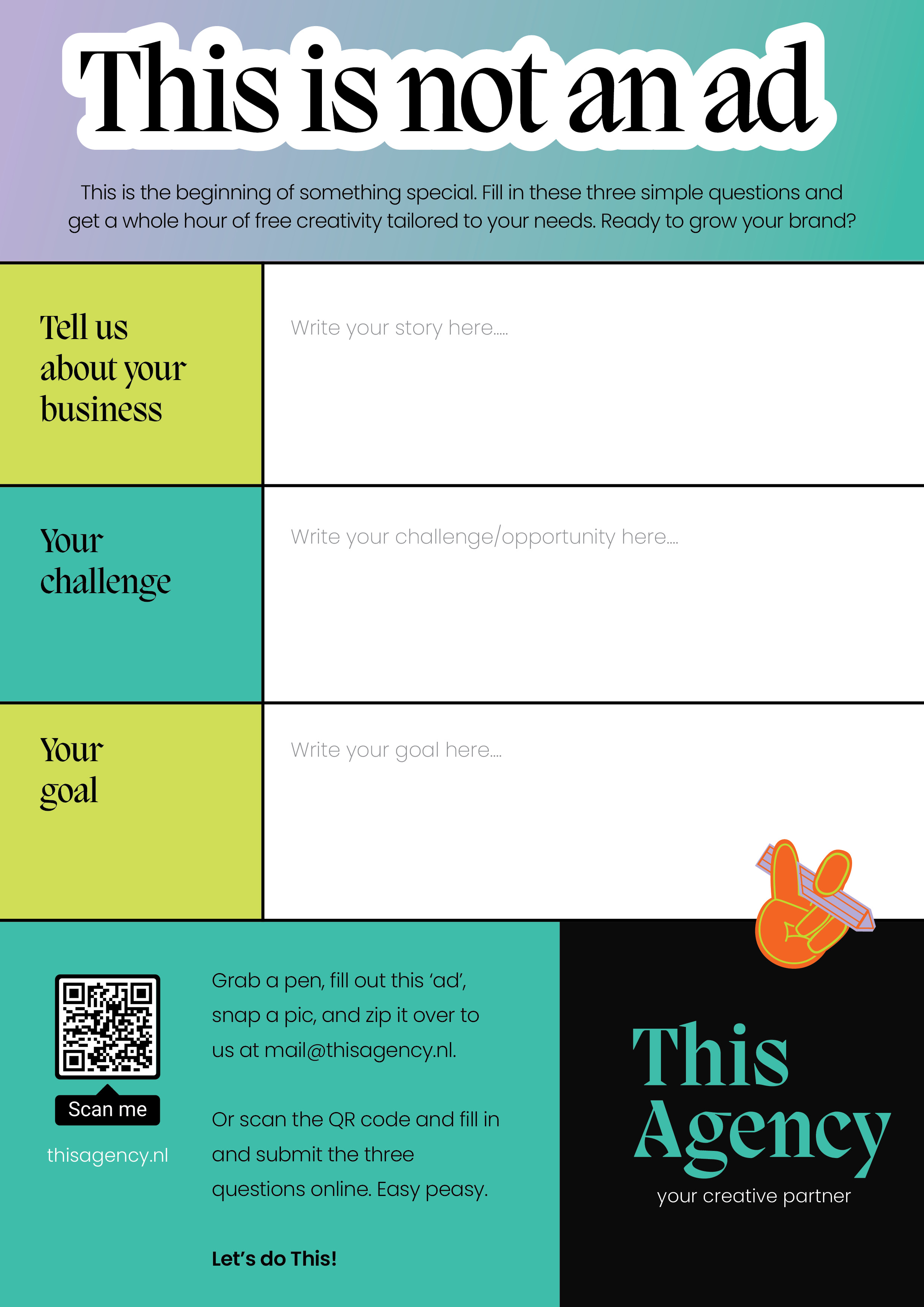 De advertentie in kwestie is een vragenlijst die zowel in fysiek als online door marketeers en ondernemers kan worden ingevuld. Iedere reactie krijgt van This Agency een uur gratis creativiteit.