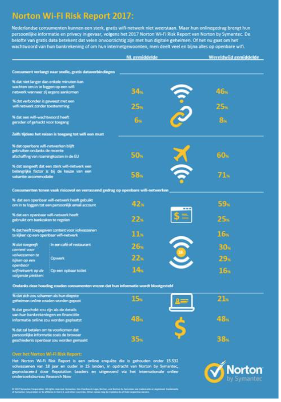 Nederlandse consumenten kunnen een sterk, gratis wifi-netwerk niet weerstaan. Maar hun onlinegedrag brengt hun persoonlijke informatie en privacy in gevaar, volgens het 2017 Norton Wi-Fi Risk Report van Norton by Symantec dat vandaag is gepubliceerd.