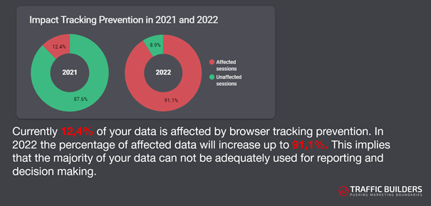 Veel cookies zijn vanaf 2022 onbruikbaar, waardoor adverteerders en marketeers naar de Cookieless Era gelanceerd worden. Voor adverteerders en marketeers betekent dit dat 80% van de data die nu nog inzichtelijk is, in 2022 niet langer beschikbaar zal zijn. Dit heeft enorme impact op marketing zoals we die momenteel kennen. Uit de DDMA Barometer 2021 blijkt slechts 9% gereed te zijn voor de cookieless world. Daarom heeft Traffic Builders een tool ontwikkeld die met één druk op de knop de impact duidelijk maakt, om bedrijven zo goed mogelijk voor te bereiden.