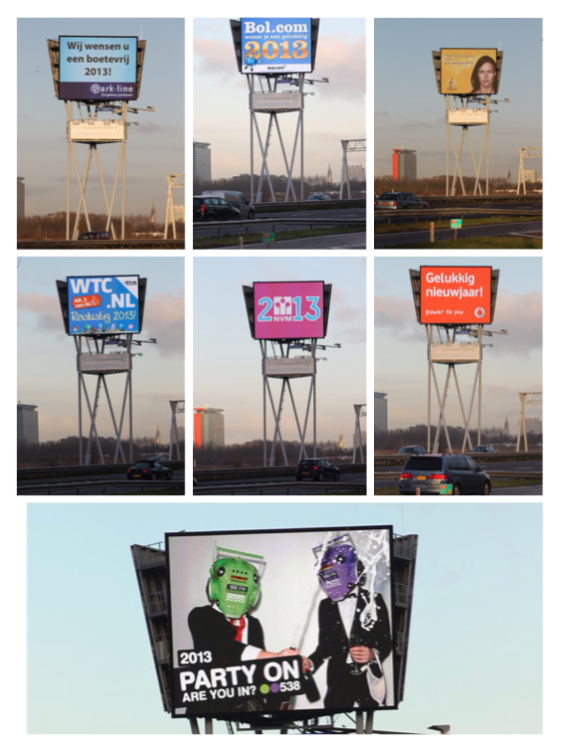 Interbest gaf een aantal klanten een gratis nieuwjaarsgroet kado. Deze uitingen werden op woensdag 2 januari op de digitale mega billboards langs de drukke A13 bij Delft en de A4 bij Schiphol getoond.