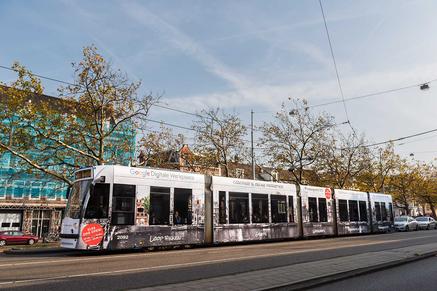 Er zijn diverse plekken waar voorbijgangers attent worden gemaakt op de nieuwe werkplaats, waar je terecht kunt voor workshops en persoonlijk advies op het gebied van Online Marketing. Op de Weteringeschans in Amsterdam is een abri die je naar de workshop-hotspot leidt, een niet te missen 3D-signing op het dak geeft met een opvallende pijl de richting van de werkplaats aan en er zijn abri’s te vinden op andere plekken in het centrum van Amsterdam. Daarnaast is de Digitale Werkplaats ruimschoots vertegenwoordigd op Amsterdamse trams.