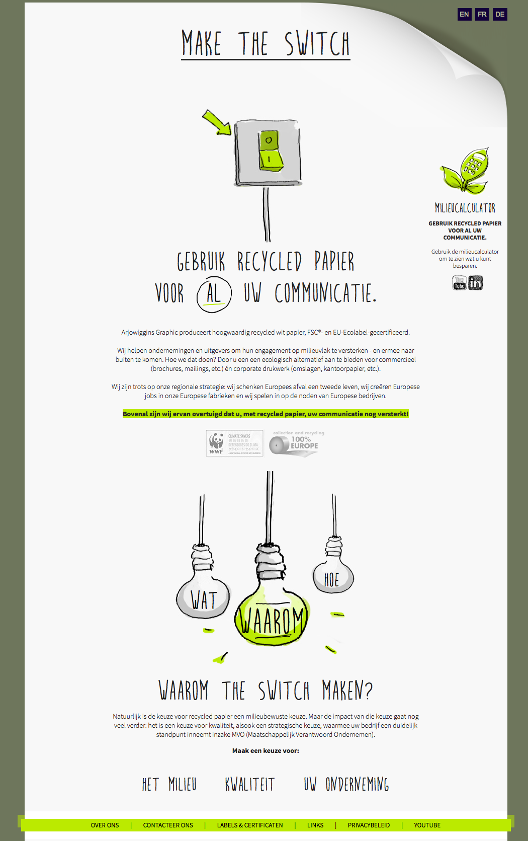 Vanaf nu leidt een schakelaar op de homepagina van MakeTheSwitch.eu naar daar waar de lamp brandt: het ‘Wat?’, ‘Hoe?’ en ‘Waarom?’ van gerecycleerd papier. Arjowiggins Graphic wil met deze website professionele gebruikers van papier informeren over de ecologische waarde en het grote aanbod van gerecycleerd papier.