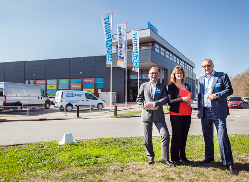 Roy Wijmans, Jacqueline Visser en Henk Wijmans voor het nieuwe pand van Gigaprint in Almere.